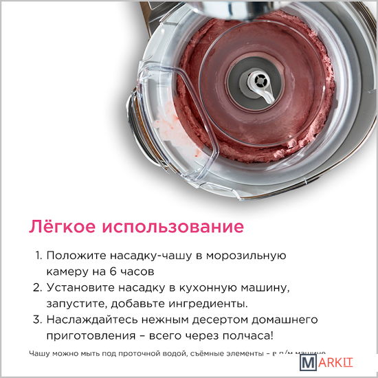 Насадка может удобно расположиться внутри чаши вашего Kenwood Chef и укомплектована всем необходимым, включая чашу для предварительного замораживания, лопатку для смешивания и переходник для чаши.