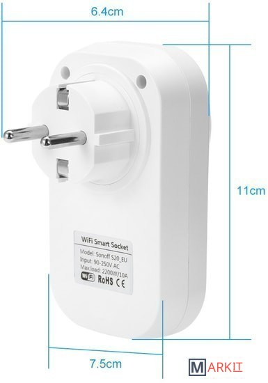 Sonoff S20 - это умная Wi-Fi розетка, с функцией дистанционного/удаленного управления. Устройство легко подключается к любой Wi-Fi точке доступа, и становиться доступно для управления из любой точки мира, где Вы сможете получить доступ к сети интернет.Просто вставив Sonoff S20 в любую розетку, и установив на Ваш смартфон приложение «eWeLink», Вы сможете удаленно управлять и контролировать подключённые через неё электроприборы из любого места, и в любое время.В Sonoff S20 так же предусмотрено и голосовое управление через Amazon Alexa или Google Assistant. Кроме того производитель предусмотрел и «ручное» управление, для чего удобно расположил на передней панели модуля кнопку включения/выключения.Sonoff S20, как и все другие устройства от компании Sonoff, обладает полноценным функционалом управления над подключенными к ней электроприборами. Sonoff S20 позволяет создавать сценарии, настраивать автоматическое включениевыключение по установленному Вами графику, позволяет видеть статус «online», задавать таймеры (до 10 таймеров). А так же уже имеет установленные функции «Scene» и «Smart Scene», функцию повторения (repeat), функцию обратного отсчета (countdown).- Стандарт силовой «вилки» (штекера): EU вилка Тип F (Schuko)- Рабочее напряжение питания: AC 90-250В, 50/60Гц;- Максимальный ток нагрузки: 10A;- Максимальная мощность: 2200W;- Беспроводная связь: Wi-Fi 2.4GHz b/g/n;- Протоколы безопасности: WEP/WPA-PSK/WPA2-PSK;- Габаритные размеры: 110х62х35(72) мм.